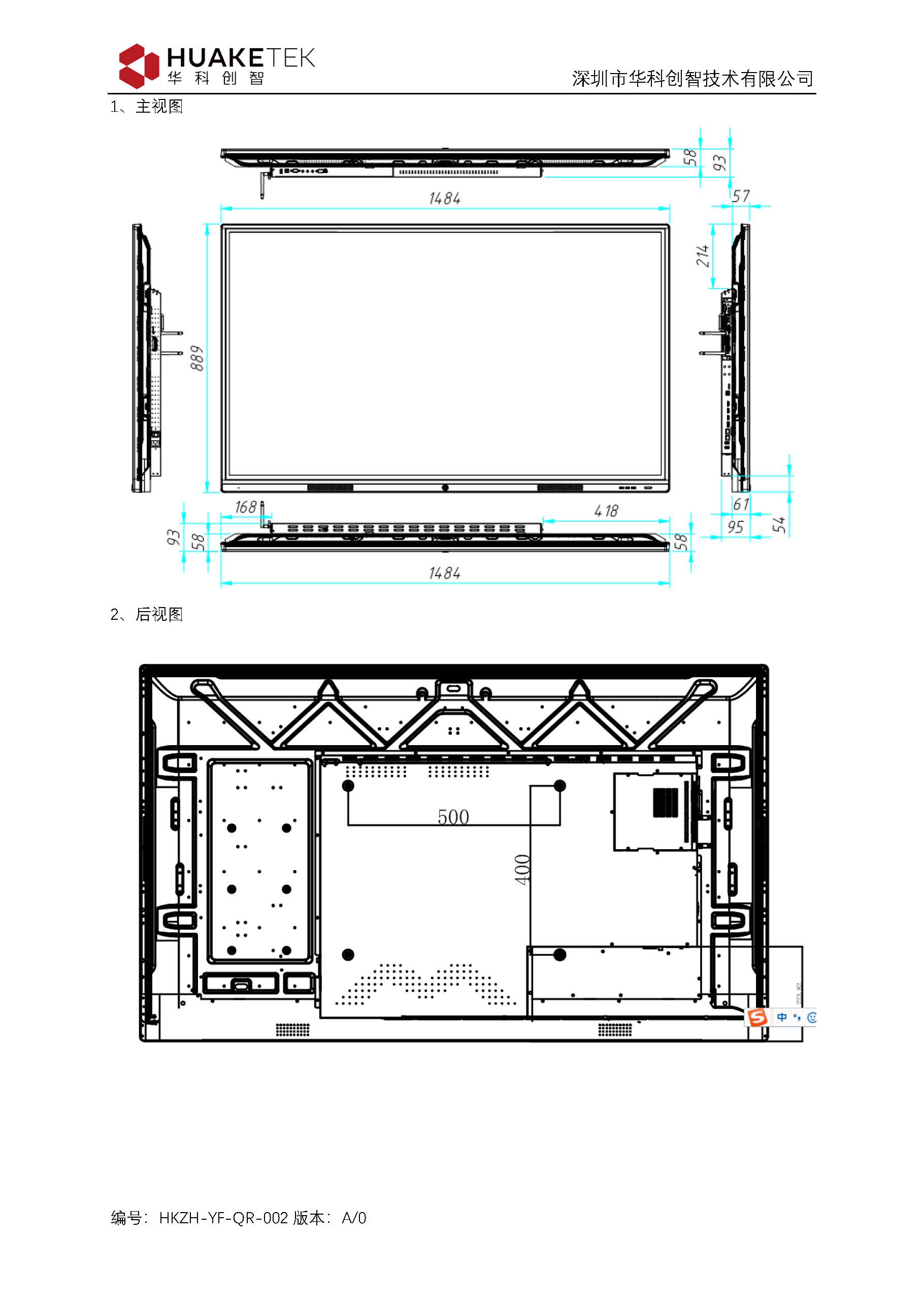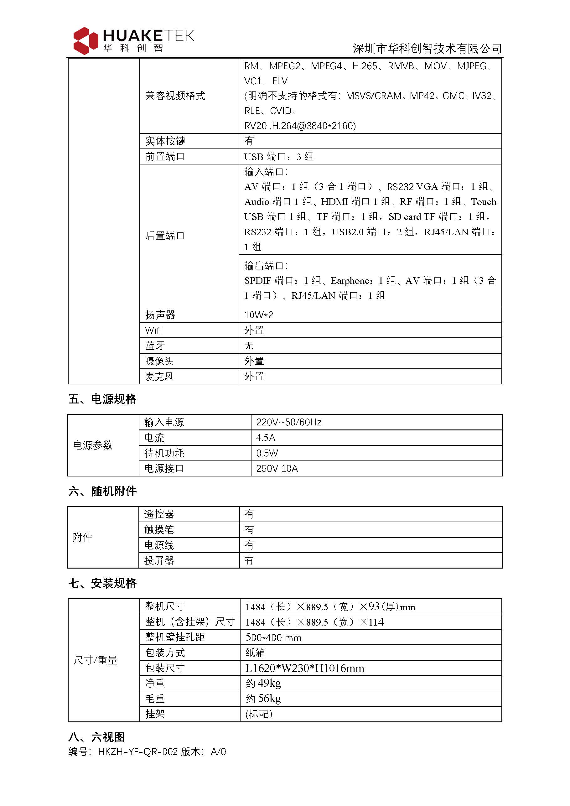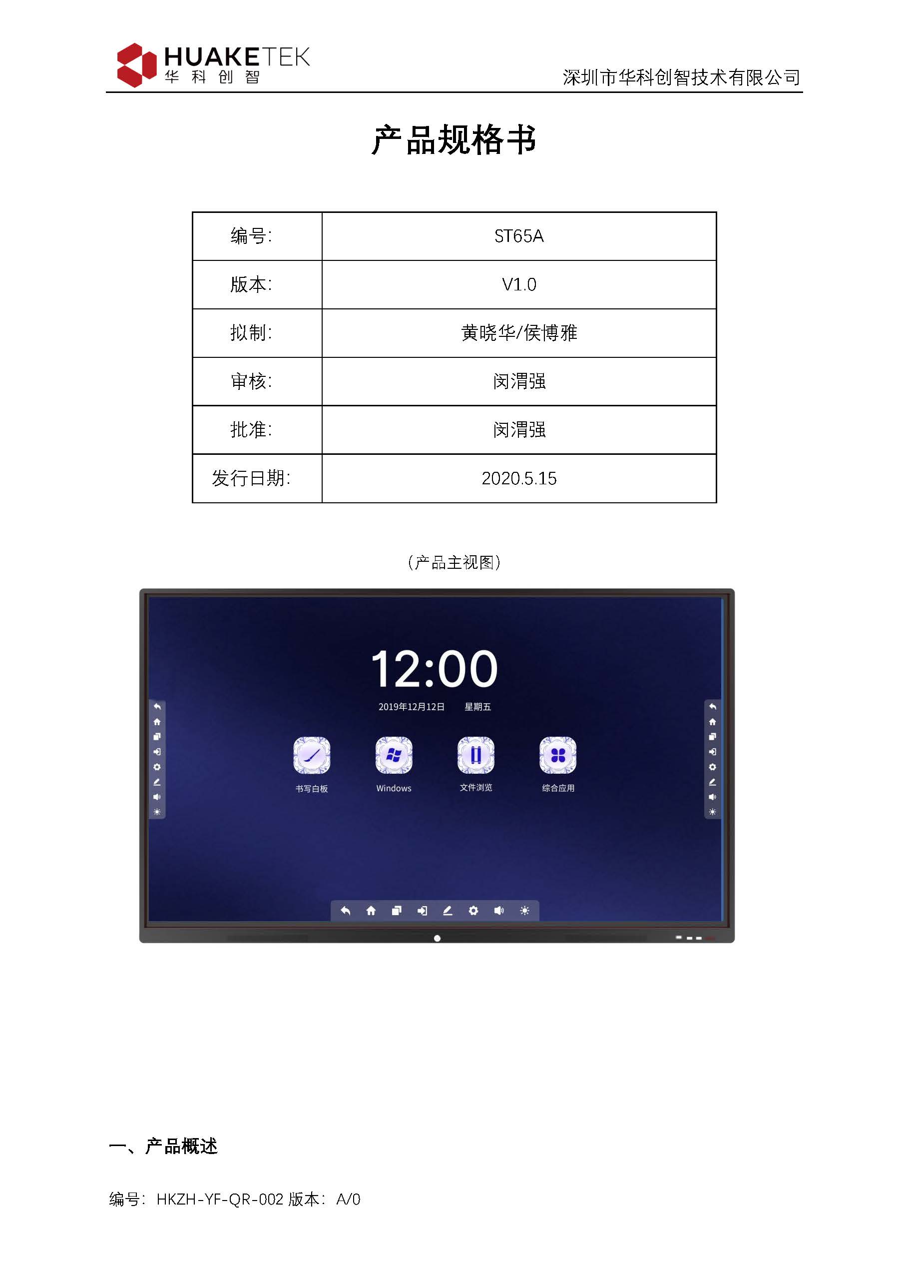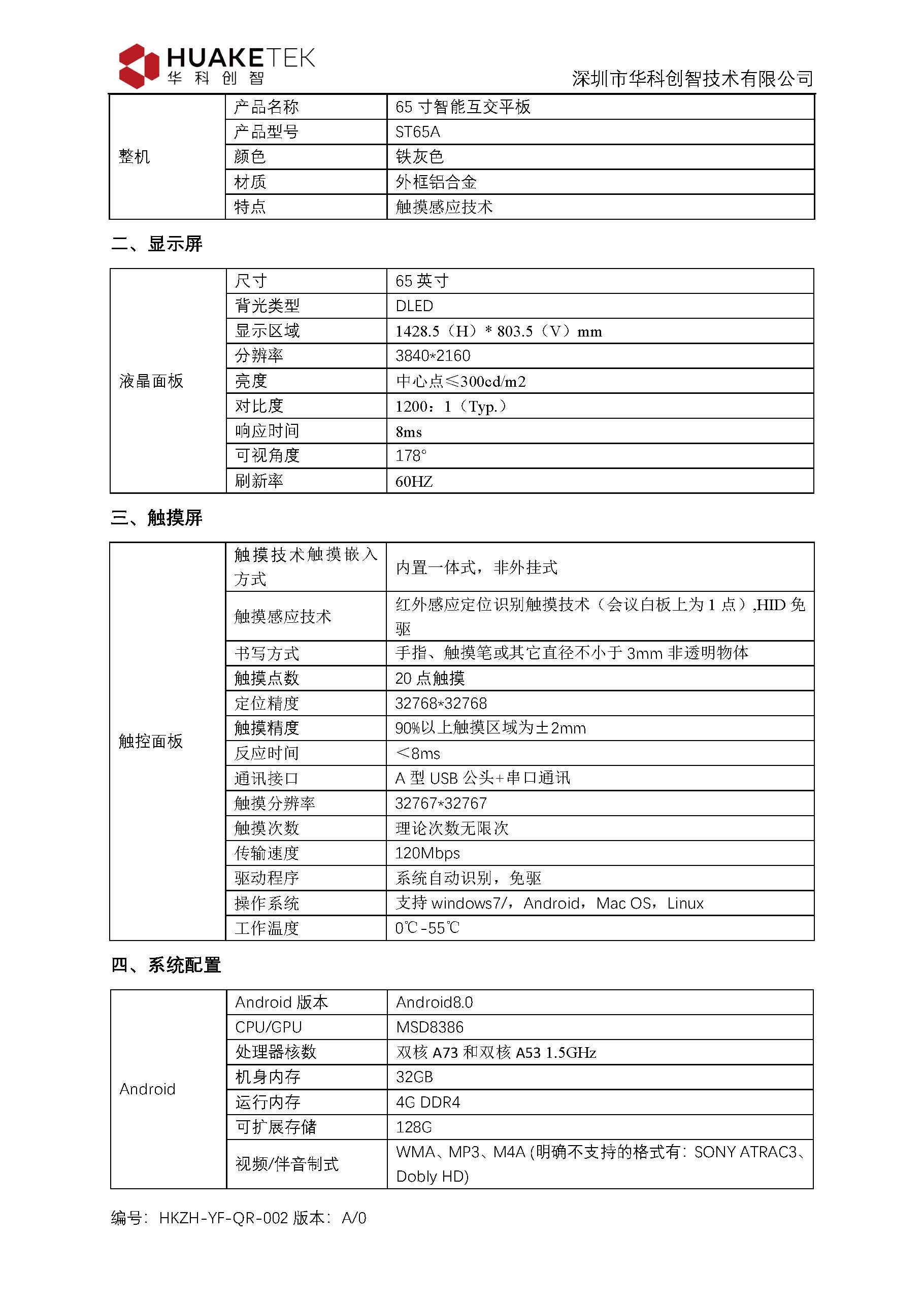 商品名称:华科创智 ST65A 触摸一体机 65英寸 (i7/8GB/256GB SSD/移动支架/无线投屏器/安装调试费用)
