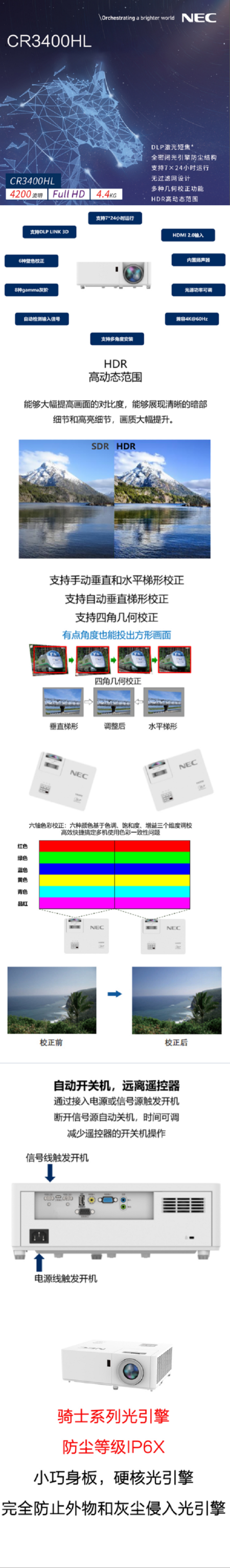 商品名称:NEC NP-CR3400HL 投影机 投影仪 激光光源 (1080P DLP HDR 支持7*24小时运行)含120寸电动幕布 包安装调试