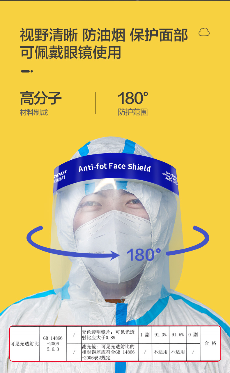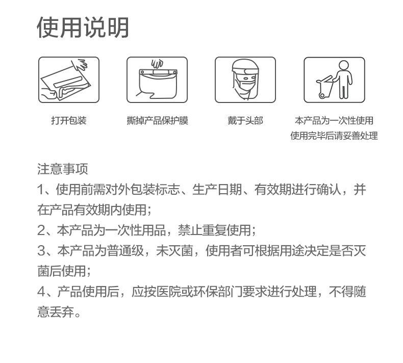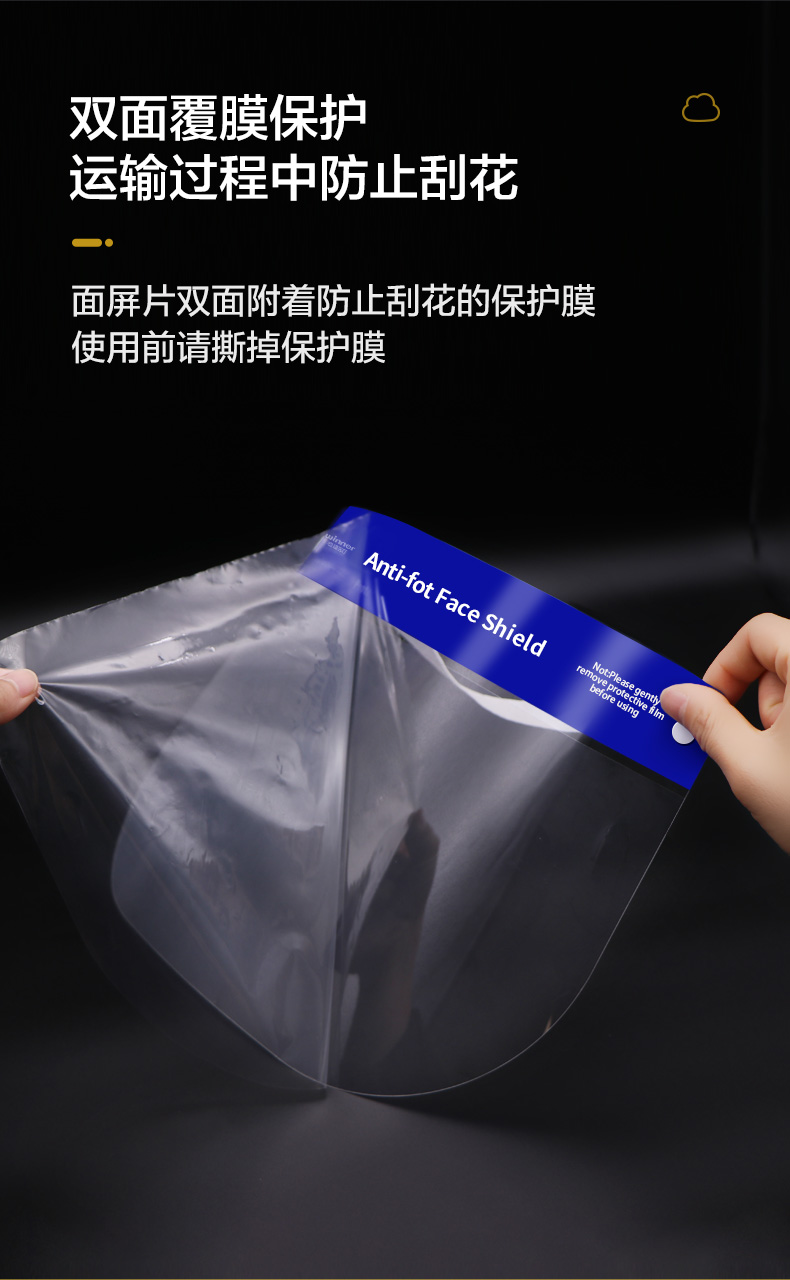 1.请在使用前撕开面罩表面的薄膜; 2.若用于医疗行业,请勿重复使用;