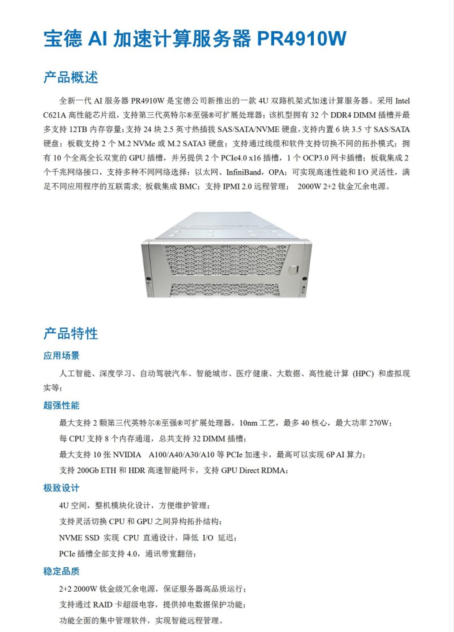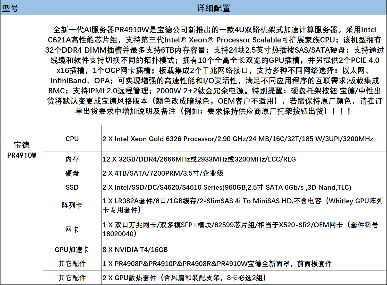 商品名称:宝德PR4910W服务器(CPU:2 X Intel Xeon Gold 6326 Processor/内存12X32GB/DDR4/硬盘2X4TB/SSD 2X960GB/阵列卡1XLR382A套件/GPU加速卡8XNVIDIA T4/16GB其它配件1 X PR4908P/其它配件2 X GPU散热套件,含税、含运费、含三年质保)