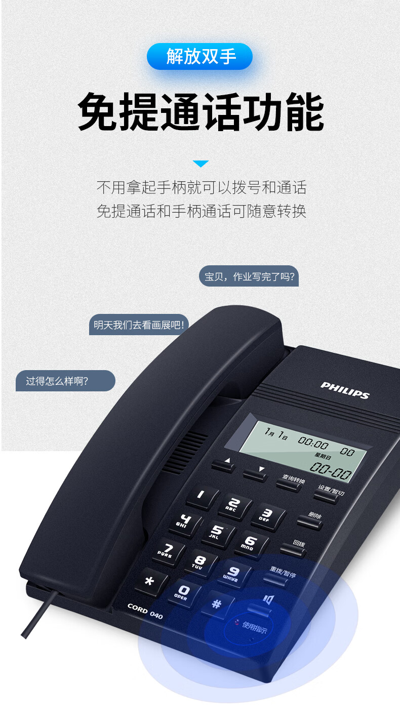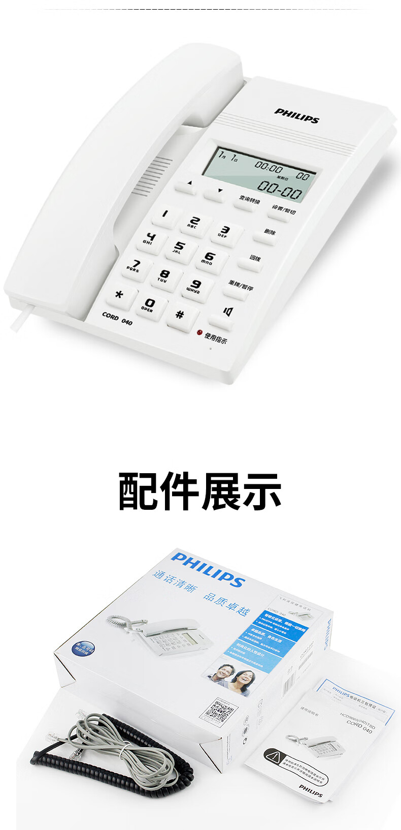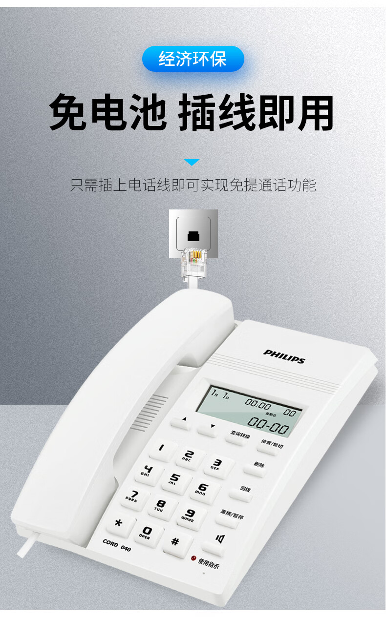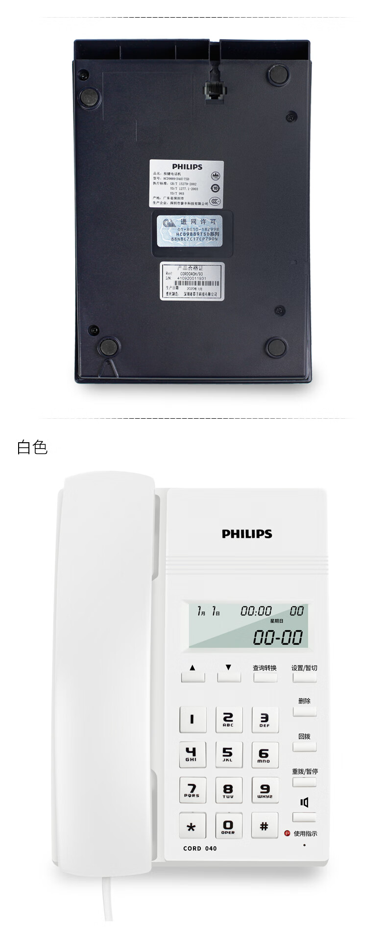 商品名称:飞利浦电话机座机 免提通话 免电池 CORD040白色