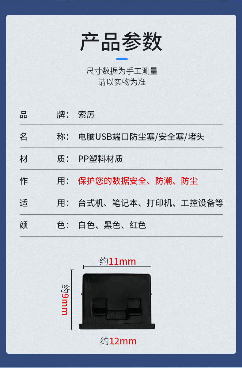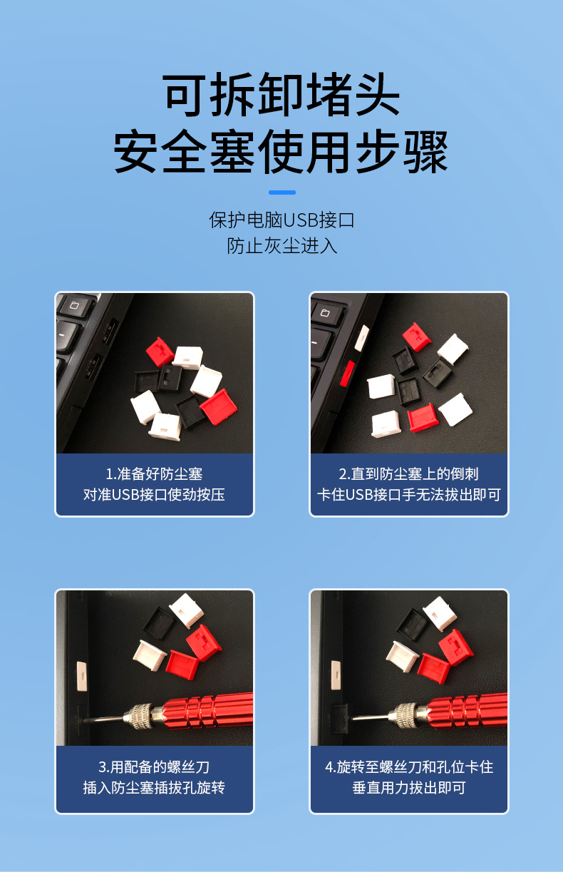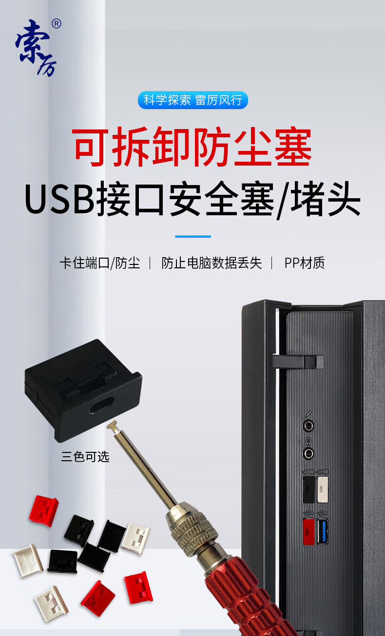 商品名称:索厉 USB安全锁可拆卸式USB安全塞封口塞防尘塞/USB通用堵头安全塞/工具2把+黑色塞子100个装/20085