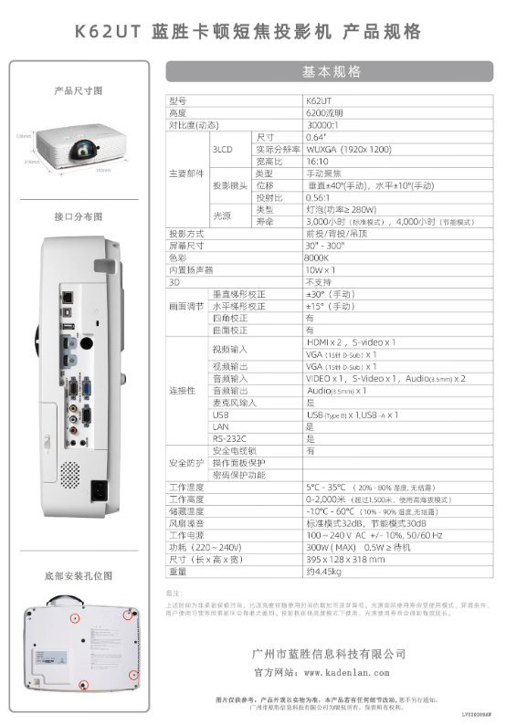 商品名称:K62UT 3LCD蓝胜卡顿短焦投影机